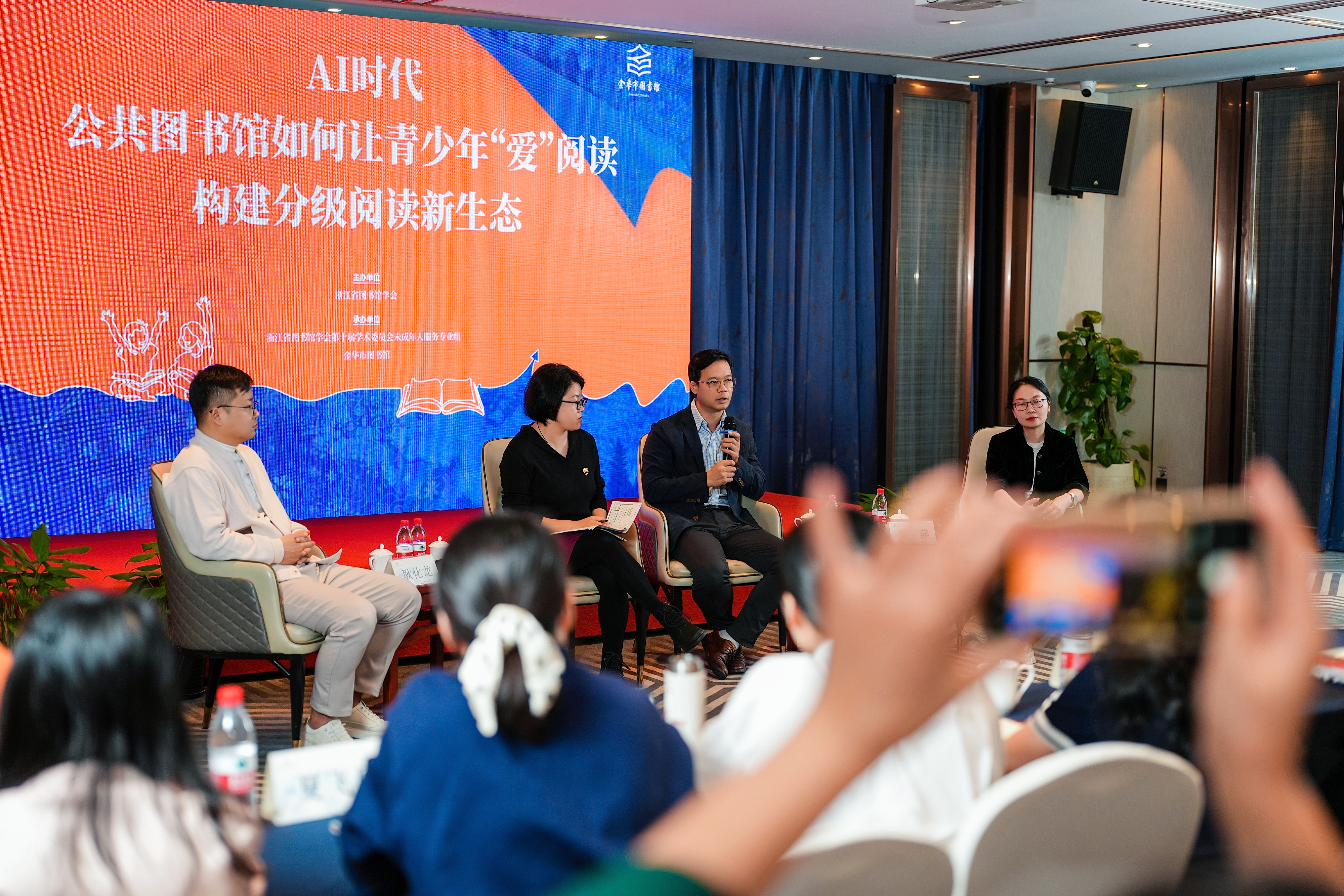 本次学术交流由浙江省图书馆学会主办,浙江省图书馆学会第十届学术委员会未成年人服务专业组、金华市图书馆承办。除四位嘉宾的主旨发言外,还设置了案例分享与跨界对谈。金华市图书馆、温州市图书馆、宁波市图书馆和杭州市图书馆分别做了青少年分级阅读推广项目成果分享交流,金华市东苑小学教育集团总校长倪崚嶒、金华市图书馆副研究馆员贡燕、山东分级悦读大数据有限公司总经理耿化龙等从学校、图书馆、科技企业角度,围绕“AI时代,公共图书馆如何让青少年‘爱’上阅读,构建分级阅读新生态”,探讨数据与智能如何为阅读和教育注入新活力。