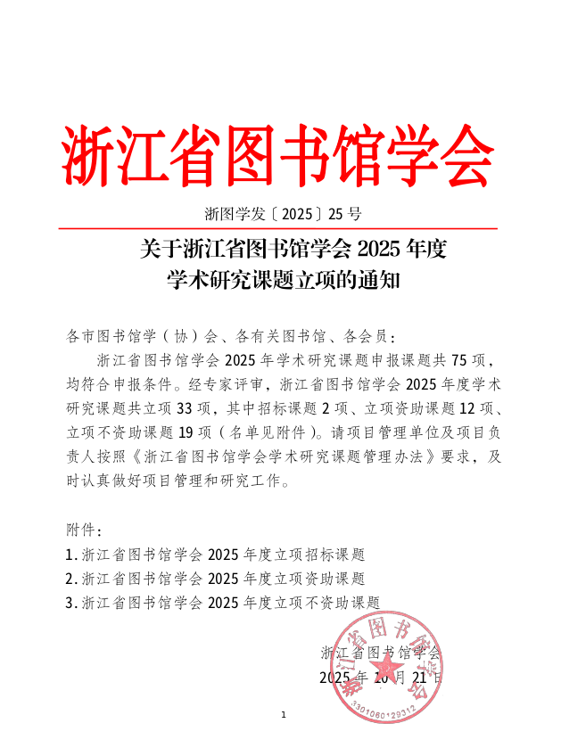 关于浙江省图书馆学会2025年度学术研究课题立项的通知