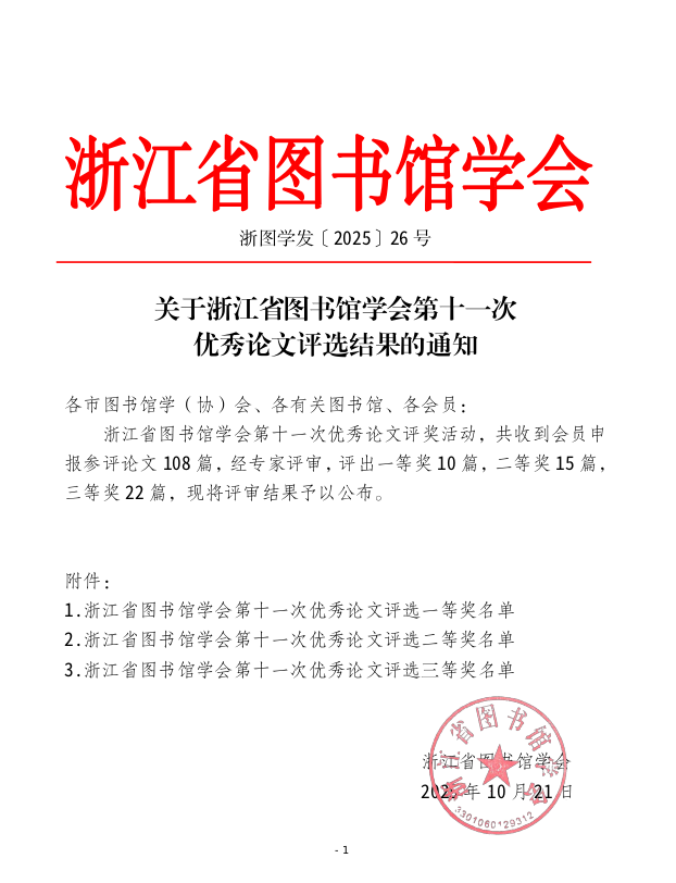 关于浙江省图书馆学会第十一次优秀论文评选结果的通知