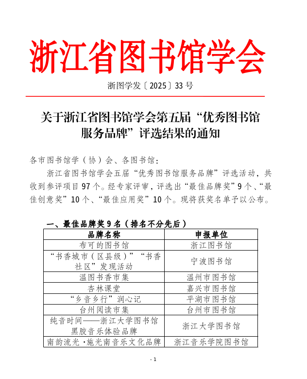 关于浙江省图书馆学会第五届“优秀图书馆服务品牌”评选结果的通知